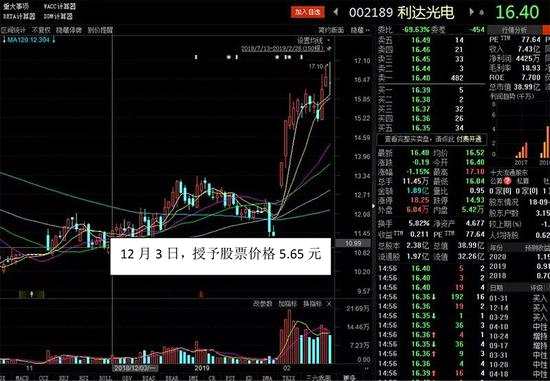 據(jù)查詢,2018年12月3日,利達(dá)光電發(fā)布激勵(lì)預(yù)案,擬向包括公司董事長(zhǎng)在內(nèi)的高管授予196.3萬(wàn)股限制性股票,授予價(jià)格為5.65元每股,公司最新股價(jià)16.4元,浮盈約190%。2月14日,公司已經(jīng)向103名激勵(lì)對(duì)象授予了176.7萬(wàn)股。