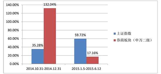此后,上證指數(shù)一路上行,從2015年1月5日首個(gè)交易日3258.63點(diǎn)開盤一路上漲至6月12日盤中最高5178.19點(diǎn),區(qū)間漲幅為59.72%,但此段時(shí)間內(nèi)證券板塊區(qū)間漲幅僅為17.16%,板塊輪動已經(jīng)切換至其他板塊。