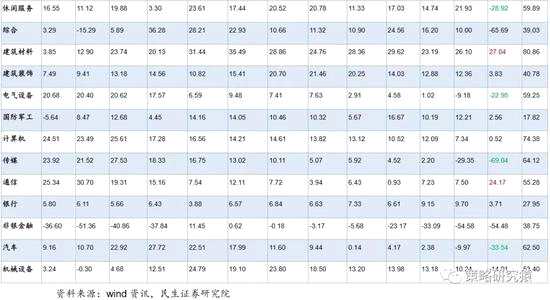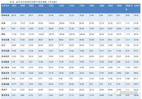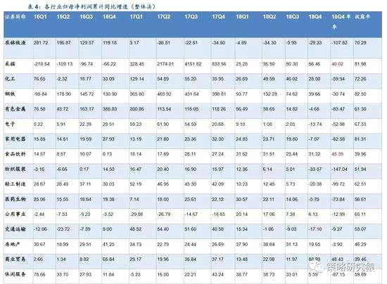 剔除股票的依據(jù)。由于大多數(shù)行業(yè)和板塊的披露率離100%尚有一定距離,個(gè)別盈利變動(dòng)較大,且其變動(dòng)難以代表行業(yè)或相關(guān)板塊情況的公司可能對結(jié)果造成較大干擾,我們剔除部分上市公司的數(shù)據(jù)。對于2018年歸母凈利潤與上年同期相比變動(dòng)較大(增長或下降超過20億元)的公司,如果其利潤變化主要來源于非經(jīng)常性損益,或非系統(tǒng)性問題(如企業(yè)出現(xiàn)流動(dòng)性問題或大額資產(chǎn)減值),從而無法代表行業(yè)盈利變化趨勢,則我們將其剔除。據(jù)此,我們剔除天神娛樂、中興通訊、【龐大集團(tuán)(601258)、股吧】(維權(quán))、*st凱迪、華映科技、華業(yè)資本、華聞傳媒、利源精制(維權(quán))、東方精工、*st工新、*st華信、華錄百納、飛樂音響(維權(quán))、鵬起科技、雛鷹農(nóng)牧、印紀(jì)傳媒、康尼機(jī)電(維權(quán))、掌趣科技、宏達(dá)股份、勁勝智能、聯(lián)建光電(維權(quán))、st冠福、st中南、人福醫(yī)藥、寧波東力(維權(quán))、*st中絨、西寧特鋼、聚力文化、大洋電機(jī)、富臨精工、盾安環(huán)境、猛獅科技、中孚實(shí)業(yè)、*st保千、*st宜化、*st龍力、*st東凌、*st大唐,樂視網(wǎng)。根據(jù)慣例,創(chuàng)業(yè)板剔除溫氏股份、樂視網(wǎng)。