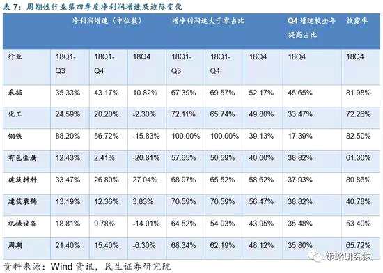 整體上看,采掘、食品飲料、建材行業(yè)第四季度盈利維持較高增速,建筑裝飾行業(yè)盈利出現(xiàn)向上拐點(diǎn)。以整體法計(jì)算,披露率超過40%的行業(yè)中,采掘、食品飲料、建材行業(yè)第四季度凈利潤增速均約為40%,表明油氣、白酒、水泥等行業(yè)景氣度較高。而建筑裝飾行業(yè)第四季度凈利潤增長14%,明顯高于全年8%的增速,表明基建產(chǎn)業(yè)鏈已經(jīng)明顯復(fù)蘇,2019年可重點(diǎn)關(guān)注。