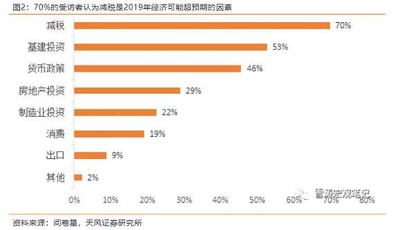 去年12月24日,我們發(fā)布報告《2019年可能存在的3個“預期差”》,其中第三項就是要“客觀看待減稅空間和效果”。在11月底進行的問卷調(diào)查中,市場普遍對減稅降費抱有較高期待,70%的受訪者將減稅視為2019年經(jīng)濟增長超預期的主要因素,其中規(guī)模最大的當屬“增值稅減稅”。