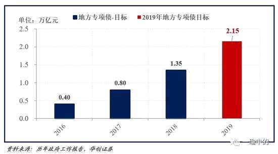 地方專項債:2018年目標安排地方專項債1.35萬億元;2019年安排地方專項債2.15萬億元。