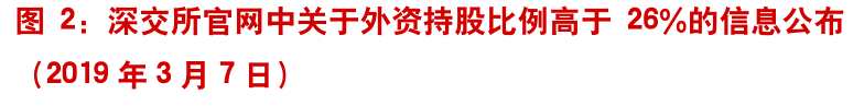 從上交所以及深交所的信息公布上來看,深交所上市公司中外資合計持股比例高于 26%的上市公司是 19 年 3 月 5 日的美的集團(tuán)、大族激光,這兩只股票是 19 年 1 月末才開始提示 26%的持股比例的,而之前則追溯到 15 年的格力電器。上交所公布的最近外資持股比例高于 26%的是 18 年 6月 15 日的上海機(jī)場,此后上交所沒有出現(xiàn)外資持股比例高于 26%的個股。
