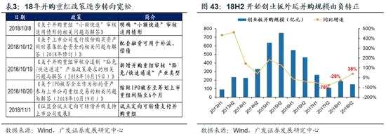 并購周期逐步啟動(dòng),創(chuàng)業(yè)板外延并購增速轉(zhuǎn)正。去年10月以來,政策轉(zhuǎn)而開始鼓勵(lì)規(guī)范化并購重組,并購重組規(guī)模逐步抬升。經(jīng)測算,創(chuàng)業(yè)板18H2外延式并購增速38%,由負(fù)轉(zhuǎn)正。