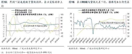 企業(yè)盈利下滑速度快于貸款利率下滑速度,如果考慮到PPI下行,企業(yè)部門實(shí)際利率在上升。A股非金融盈利增速從17Q4的32.20%下降至18Q3的16.78%,而同期金融機(jī)構(gòu)人民幣一般貸款加權(quán)平均利率反而從5.80%上行至6.19%,直到18Q4才回落至5.91%。企業(yè)盈利的下滑速度明顯快于貸款利率下滑速度。實(shí)際上,雖然名義貸款利率在18Q4開始下降,但考慮PPI之后的企業(yè)部門實(shí)際利率是在上升的。PPI從18Q3的3.6%降至18Q4的0.9%,扣減PPI后的同期實(shí)際貸款利率從2.59%上升至5.01%。