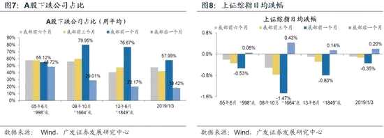 19.1.3前后下跌公司占比和指數(shù)日均跌幅在趨勢上與歷史大底一致,但絕對(duì)值偏低。05年外,前幾輪底部前最后一月市場下跌公司占比相較此前三個(gè)月、六個(gè)月均明顯放大,底部后一個(gè)月明顯下降。從環(huán)比變化來看,19月1月3日從趨勢來說與08、13大底一致,但前一月的下跌公司占比絕對(duì)值偏低。底部形成前最后1個(gè)月上證綜指日均跌幅在-0.5%至-1.5%,且相比前3個(gè)月、前6個(gè)月跌幅均有所放大。19年1月3日前1個(gè)月上證綜指跌幅有所放大,跌幅環(huán)比增速顯著上升,但跌幅絕對(duì)值偏低。