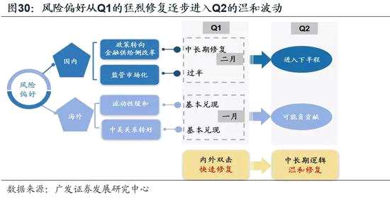 我們預(yù)計(jì)風(fēng)險(xiǎn)偏好將從Q1的猛烈修復(fù)進(jìn)入Q2的溫和波動(dòng)。主導(dǎo)二月風(fēng)險(xiǎn)偏好修復(fù)的國內(nèi)因素——政策轉(zhuǎn)向更為溫和、監(jiān)管市場化,所帶來的正向修復(fù)基本過半,將逐步從一開始的轉(zhuǎn)向沖擊帶來猛烈的風(fēng)險(xiǎn)偏好修復(fù),演變?yōu)橹虚L期邏輯。而主導(dǎo)一月風(fēng)險(xiǎn)偏好修復(fù)的海外因素——流動(dòng)性緩和、中美關(guān)系轉(zhuǎn)好,所帶來的正向修復(fù)基本完成,二季度可能因?yàn)楹M馐袌霾▌?dòng)上行而產(chǎn)生負(fù)貢獻(xiàn)。后續(xù)在風(fēng)險(xiǎn)偏好的監(jiān)測上,主要觀察金融供給側(cè)改革的推進(jìn)、監(jiān)管層對(duì)于連續(xù)漲停股和配資的態(tài)度及實(shí)際措施,以及海外市場的波動(dòng)。