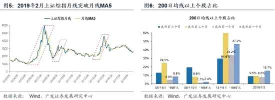 近期上證綜指月線已突破月線MA5, 200日均線以上個(gè)股占比回升。從A股歷史來看,市場底部過后,上證綜指月線將騎在5月K線上同時(shí)上行,形成矩形箱體,顯示出市場價(jià)格的持續(xù)走強(qiáng)。19年2月,在經(jīng)歷12個(gè)月月線持續(xù)低于月線MA5后,上證綜指突破月線MA5。從大底經(jīng)驗(yàn)看,底部前一月200日均線以上個(gè)股占比較底部前三月均有大幅下滑;底部后一個(gè)月較底部前一個(gè)月該比例有大幅上升。19年1月3日前后的高低趨勢符合大底特征,但環(huán)比變化不如過往大底明顯。