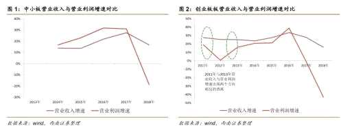 如圖8和圖10所示,2011年,創(chuàng)業(yè)板的營收增速與營業(yè)利潤增速出現(xiàn)顯著背離,然后在2013年又出現(xiàn)了反向背離,當時營業(yè)收入增速平穩(wěn),但營業(yè)利潤增速快速上行,從而帶來了一輪轟轟烈烈的創(chuàng)業(yè)板牛市。在目前中小創(chuàng)營收仍然穩(wěn)健增長的狀況下,其歸母凈利潤增速將在2019年獲得明顯改善,這就使得創(chuàng)業(yè)板的表現(xiàn)很可能是一個弱化版的2013年。