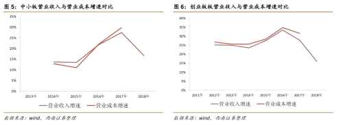 那么,有沒有可能是營業(yè)成本快速上升造成的?我們認為這種可能性不大。我們考察了往年中小創(chuàng)的營業(yè)收入增速與營業(yè)成本增速的走勢對比,發(fā)現(xiàn)兩者的增速呈現(xiàn)基本同步狀態(tài)。營業(yè)收入增速提高的時候,營業(yè)成本增速也相應(yīng)提高,反之亦然。當前的業(yè)績快報雖然沒有公布2018年的營業(yè)成本,但根據(jù)以往的規(guī)律,兩者仍然應(yīng)該是同步變化。
