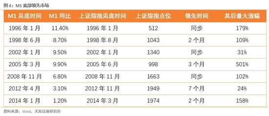如圖片和表格所展示的,M1的底部,對于市場的底部而言,具有明顯的指示意義,每一輪大行情之前,M1的大底部都會率先到來。