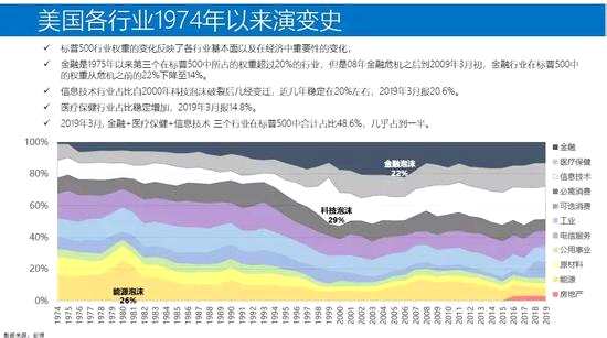 在科技進(jìn)步上很重要的一點(diǎn),就是看行業(yè)的變遷。我們比較美國(guó)的情況,看看美國(guó)標(biāo)普指數(shù)中行業(yè)權(quán)重的變化。1974年前,美國(guó)的金融行業(yè)在比重里面占的是挺低的,1975年以來比重逐漸上升,超過了20%的比重。