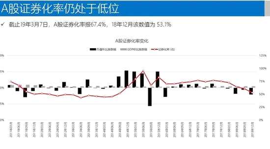 中國(guó)這個(gè)現(xiàn)象我估計(jì)很長(zhǎng)時(shí)間都變不了,到現(xiàn)在,浮起來的很多是垃圾。拿一個(gè)數(shù)據(jù)說明下我們現(xiàn)在的市場(chǎng)水平,我們的A股證券化率仍處于低位,截止到今年的3月7日,A股的證券化率報(bào)67.4%,去年是53.1%。我們的證券化率,如果加上港股紅籌股和中概股,所有加起來達(dá)到85%。但分母每年在擴(kuò)張,以6%左右的增速在擴(kuò)張。美國(guó)2017年證券化率為166%,與它相比我們總體來講證券化率不高。另外從圖上可看出目前A股的估值仍處于低位。