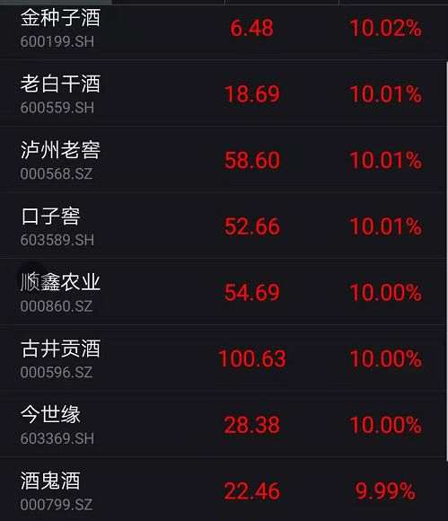 貴州茅臺并不是今日市場唯一的亮點。兩市所有板塊都在上漲,白酒板塊更是掀起了漲停潮,【瀘州老窖(000568)、股吧】、古井貢酒、順鑫農(nóng)業(yè)、酒鬼酒等紛紛漲停。