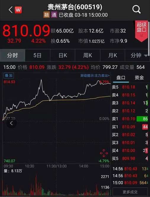 18日,A股“股王”【貴州茅臺(600519)、股吧】股價突破800元,盤中最高達(dá)到814.53元,創(chuàng)出歷史新高。截至收盤,貴州茅臺報810.09元,上漲4.22%。這也是貴州茅臺收盤首度站上800元大關(guān)。截至收盤,茅臺市值達(dá)到10176億元。
