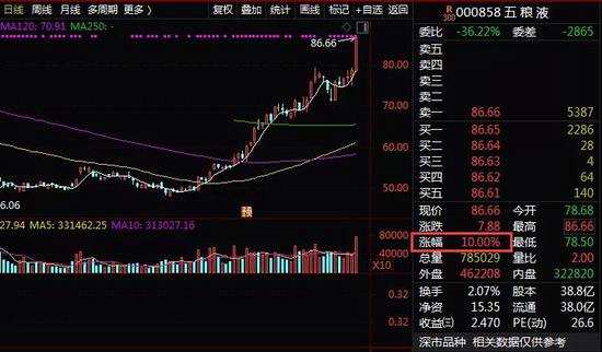 另一只白馬股【五糧液(000858)、股吧】則更是強勢漲停。數(shù)據(jù)顯示,這是五糧液時隔三年多首次漲停。