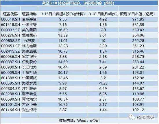 進(jìn)步一來(lái)看,多達(dá)18只滬、深股通標(biāo)的持倉(cāng)金額超過(guò)100億元,吸納了半數(shù)以上市值規(guī)模,其中貴州茅臺(tái)持倉(cāng)逼近1000億元?jiǎng)?chuàng)新高;3月18日當(dāng)天,超過(guò)30只互通標(biāo)的漲停,平均持倉(cāng)規(guī)模在12億左右。