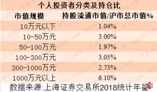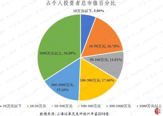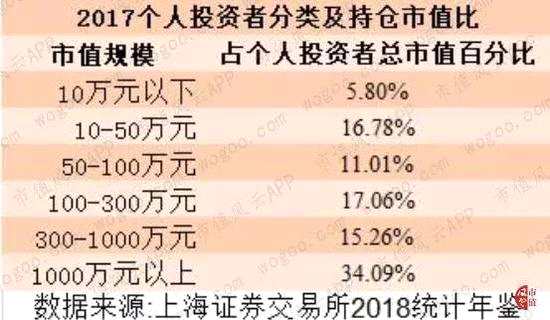 上交所統(tǒng)計(jì)年鑒2018卷顯示,滬市中小投資者持股市值占個(gè)人持股總市值的22.58%,10萬元以下的投資者占比5.8%。