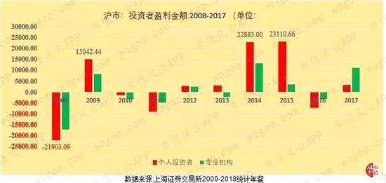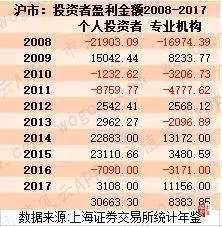 2008-2017年十年間,個(gè)人投資者盈利金額總和30663.3億,盡管2008年虧掉2.19萬億,卻分別在2009年盈利超過1.5萬億,并在2014年和2015年連續(xù)盈利超2.2萬億。