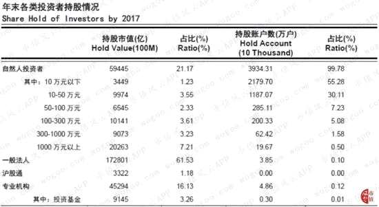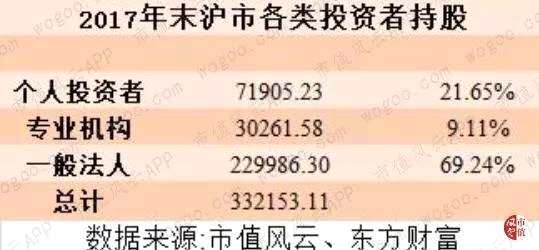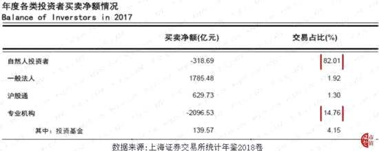 上交所統(tǒng)計(jì)數(shù)據(jù)顯示,2017年全年自然人投資者的交易占比高達(dá)82.01%,專業(yè)機(jī)構(gòu)交易占比14.76%,二者持股市值分別為59445億和45294億。