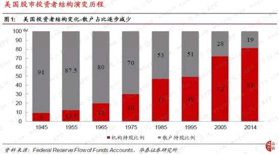 【華泰證券(601688)、股吧】研報(bào)顯示,美國(guó)在1950年散戶持股比例高達(dá)90%以上,隨著美國(guó)股票市場(chǎng)的發(fā)展,呈現(xiàn)出“去散戶化”的趨勢(shì)。