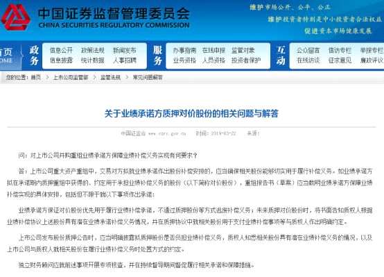 有從事并購重組的投行人士對記者表示,很多并購重組交易中,交易對方都會(huì)獲得上市公司的股份和現(xiàn)金,股份一般會(huì)占到50%以上,并且會(huì)承諾用股份履行業(yè)績補(bǔ)償?shù)牧x務(wù),此前偶爾會(huì)出現(xiàn)業(yè)績承諾股票被質(zhì)押的情況,以致影響業(yè)績補(bǔ)償?shù)挠行浴WC監(jiān)會(huì)的最新解答,能更好維護(hù)上市公司的合法權(quán)益。