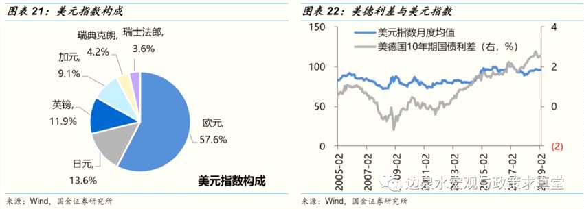 第三,美元指數(shù)進(jìn)一步上行空間不大。美元指數(shù)走勢是影響中美匯率的重要因素。2018年美元指數(shù)強(qiáng)勢上漲導(dǎo)致人民幣匯率貶值。2015年底以來,美聯(lián)儲已經(jīng)8次加息,貨幣政策正?;阎鸩阶叩轿猜暎S著美國經(jīng)濟(jì)即將見頂,未來美元指數(shù)進(jìn)一步上升空間已經(jīng)不大。從美元指數(shù)的構(gòu)成中分析,歐元在美元指數(shù)的構(gòu)成中比重達(dá)到57.60%,是最重要的貨幣之一。歐央行2018年年底徹底結(jié)束QE,歐央行貨幣政策正常化才剛剛開始,兩大央行貨幣政策從分化趨于收斂,此外,美德利差也將逐漸收窄,這些因素將對美元指數(shù)形成拖累。