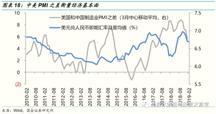 首先,中美經(jīng)濟(jì)從分化到收斂。長期來看,匯率本質(zhì)上是由兩國經(jīng)濟(jì)基本面來決定,2018年美國經(jīng)濟(jì)周期處于上行階段,而我國經(jīng)濟(jì)存在下行壓力,人民幣貶值壓力根源在于中美經(jīng)濟(jì)基本面的分化。PMI是經(jīng)濟(jì)增長的超前指標(biāo),以中美兩國PMI之差來衡量經(jīng)濟(jì)基本面差異可以發(fā)現(xiàn),2018年四季度以來中美PMI之差邊際收斂(美國PMI開始回落,中美PMI趨穩(wěn)),且與人民幣匯率具有很高的相關(guān)性。美國期限利差倒掛、美股大跌均預(yù)示美國經(jīng)濟(jì)見頂,反觀中國經(jīng)濟(jì)已度過快速下降期。預(yù)計(jì)中美經(jīng)濟(jì)分化將逐步收斂,人民幣貶值壓力將會減輕。