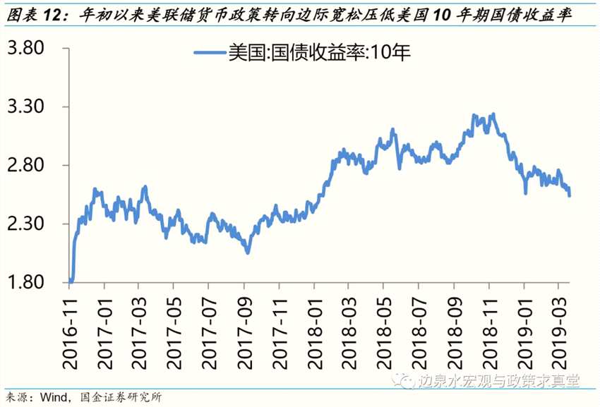 2、外部:中美經(jīng)濟(jì)周期從分化走向收斂。1)中美經(jīng)濟(jì)增速從分化走向收斂。4Q2018,中美名義GDP增速收窄至近兩年低點(diǎn)。2019年,隨著特朗普順周期減稅效應(yīng)的消退、貿(mào)易戰(zhàn)的外部沖擊負(fù)面影響顯現(xiàn)以及美聯(lián)儲加息對投資的抑制,美國經(jīng)濟(jì)增速將開始回落,并可能明顯減速,中美名義GDP增速差值有望轉(zhuǎn)向擴(kuò)大。2)美聯(lián)儲轉(zhuǎn)向邊際寬松,全球央行逐步進(jìn)入降息周期,美股反彈。美聯(lián)儲的邊際寬松,打壓無風(fēng)險(xiǎn)利率,提振美國股市年初以來的反彈。