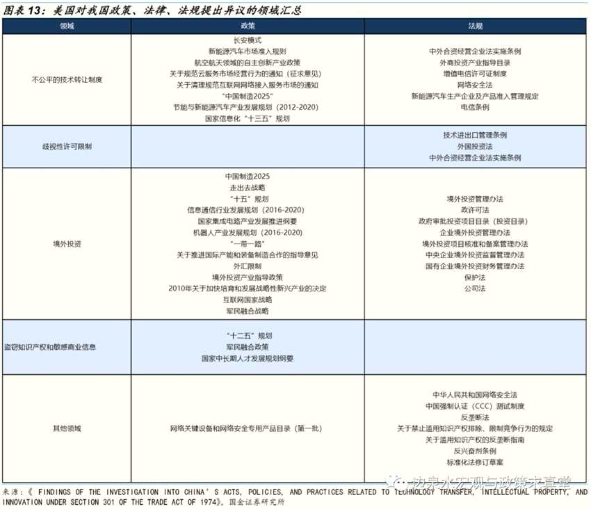 2018年中美兩國互列加征關(guān)稅清單,中美貿(mào)易摩擦升級。2017年8月14日,美國總統(tǒng)特朗普向美國貿(mào)易代表辦公室(以下簡稱USTR)發(fā)布備忘錄,要求USTR針對我國展開301調(diào)查。2017年8月18日,USTR啟動調(diào)查。USTR分別于3月和11月發(fā)布兩份301調(diào)查報(bào)告。USTR認(rèn)為我國技術(shù)轉(zhuǎn)讓制度不合理、許可制度存在歧視性、存在入侵美國商業(yè)網(wǎng)絡(luò)行為等,認(rèn)定我國的行為、政策或者措施存在不合理、歧視性,損害了美國商業(yè)利益。兩份301調(diào)查報(bào)告透露了三層核心信息,分別為:一是指責(zé)我國政府過度參與經(jīng)濟(jì)活動;二是指責(zé)我國政府與國有企業(yè)以及部分私有企業(yè)關(guān)系過于緊密;三是301調(diào)查重要出發(fā)點(diǎn)在于保護(hù)美國技術(shù)領(lǐng)先地位,以獲取高額回報(bào)。2018年4月3日,USTR決定對我國出口至美國的500億商品加征25%懲罰性關(guān)稅,其中340億美元商品的懲罰性關(guān)稅于7月6日開始實(shí)施,剩下的160億美元商品的懲罰性關(guān)稅于8月23日開始實(shí)施。由于我國也對美國出口至我國的500億商品加征25%的關(guān)稅,2018年9月18日,USTR宣布對我國出口至美國的2000億美元商品加征懲罰性關(guān)稅,9月28日起對2000億美元商品加征10%的懲罰性關(guān)稅,2019年1月1日起將懲罰性關(guān)稅稅率提高至25%。2018年12月1日,中美兩國元首達(dá)成共識,暫停加征新的關(guān)稅,且美國同意2019年1月1日以后對2000億美元商品加征10%的稅率,不再提高至25%。
