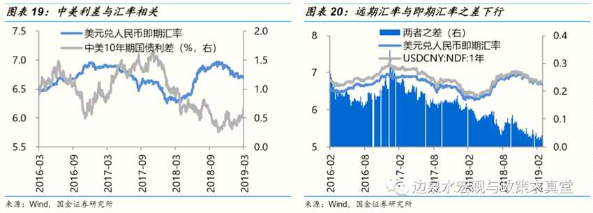 其次,中美利差將邊際走擴(kuò)。根據(jù)利率平價(jià)理論:兩國利差=本幣預(yù)期貶值率=(本幣預(yù)期匯率(或遠(yuǎn)期匯率)-本幣即期匯率)/本幣預(yù)期匯率。利率平價(jià)理論認(rèn)為兩國的利差應(yīng)等于本幣的預(yù)期貶值率,這是一個(gè)資本完全流動下的靜態(tài)均衡狀態(tài),其衡量了投資者在選擇持有不同幣種之間的利益權(quán)衡。現(xiàn)階段,中國利率高于美國,根據(jù)利率平價(jià)均衡等式,預(yù)期人民幣將在遠(yuǎn)期貶值。但無論是中美利差、遠(yuǎn)期匯率、即期匯率都在不斷變化,因此當(dāng)均衡不能維持時(shí),利差的變動會反應(yīng)在匯率上。例如,當(dāng)中美利差縮小,投資者將因套利機(jī)會將在即期市場上將人民幣換成美元,而在遠(yuǎn)期市場上將美元換回人民幣,這導(dǎo)致人民幣即期匯率貶值而遠(yuǎn)期匯率升值,重新達(dá)到利率平價(jià)均衡。從跨境資本流動的角度看,中美利差變動將影響匯率。2018年美國不斷加息而中國貨幣政策邊際寬松,2018年10月中美10年期國債利差縮小至近兩年低點(diǎn),為24bp。但是,2018年12月份以來,兩者利差出現(xiàn)走擴(kuò)跡象。未來,隨著中美經(jīng)濟(jì)增長動能趨于收斂,美國加息周期接近尾聲,中國貨幣政策以穩(wěn)為主,中美利差或?qū)⒊掷m(xù)走擴(kuò),緩解人民幣貶值壓力。
