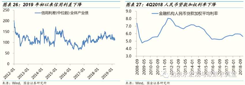 政策轉(zhuǎn)向邊際寬松,帶來的信用出現(xiàn)邊際改善,是市場預(yù)期企穩(wěn)的內(nèi)部宏觀基礎(chǔ)。本輪中國經(jīng)濟(jì)、資本市場轉(zhuǎn)向下行的主要內(nèi)部原因在于信用收縮,所以“穩(wěn)預(yù)期”就需要“穩(wěn)信用”。自2018年4季度以來,政府出臺多項(xiàng)措施來穩(wěn)定社會信用,一方面,通過傳統(tǒng)政策工具轉(zhuǎn)向邊際寬松,來營造較好的信用環(huán)境,比如貨幣轉(zhuǎn)向邊際寬松、財(cái)政通過減稅降費(fèi)變得更加積極、監(jiān)管政策松緊有度等;另一方面,通過設(shè)立多個(gè)非常規(guī)工具來為企業(yè)增信,比如創(chuàng)設(shè)CRM、最高層召開民營企業(yè)座談會、設(shè)立紓困基金等方式。隨著一系列政策的實(shí)施,我們看到信用環(huán)境確實(shí)有所改善(信用利差下降、貸款利率下降、信用供給增速企穩(wěn))。