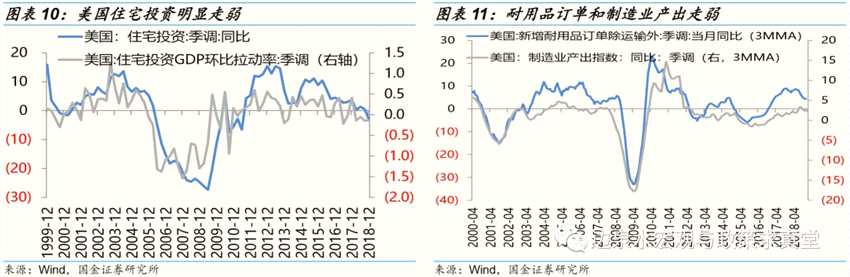 美國經(jīng)濟(jì)指標(biāo)已經(jīng)開始走弱。首先,美國軟指標(biāo)已經(jīng)開始明顯走弱。軟指標(biāo)一般代表市場信心和預(yù)期,是經(jīng)濟(jì)增長的領(lǐng)先指標(biāo),比如,美國密歇根大學(xué)消費(fèi)者信心指數(shù)一般領(lǐng)先私人消費(fèi)2-3個(gè)月左右,美國ISM制造業(yè)PMI一般領(lǐng)先美國工業(yè)產(chǎn)出一個(gè)季度左右,OECD領(lǐng)先指標(biāo)則是眾多領(lǐng)先指標(biāo)的綜合指標(biāo)。從數(shù)據(jù)來看,密歇根大學(xué)消費(fèi)者信心指數(shù)開始從高位回落,OECD綜合領(lǐng)先指標(biāo)也連續(xù)三個(gè)月下降,ISM制造業(yè)PMI從高點(diǎn)回落(但11月有所反彈),Markit制造業(yè)PMI已經(jīng)創(chuàng)出2018年新低。其次,部分美國硬指標(biāo)也開始走弱。第一個(gè)走弱的硬指標(biāo)是住宅投資。美聯(lián)儲加息對美國私人投資的負(fù)面影響開始顯現(xiàn),房地產(chǎn)市場首當(dāng)其沖。美國房貸利率明顯上升,房地產(chǎn)銷售走軟,房價(jià)轉(zhuǎn)向下行,住宅投資走弱,并對GDP形成負(fù)向拉動。第二個(gè)走弱的硬指標(biāo)是制造業(yè)產(chǎn)出。美國耐用品訂單一般領(lǐng)先制造業(yè)產(chǎn)出1-2個(gè)月。從數(shù)據(jù)來看,美國耐用品訂單(扣除運(yùn)輸品)同比增速連續(xù)下降,將拖累制造業(yè)產(chǎn)出走軟。