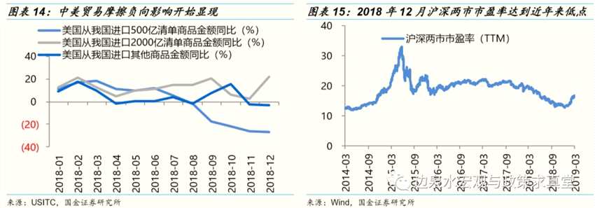 中美貿(mào)易摩擦升級不僅對我國進(jìn)出口帶來負(fù)向影響,還導(dǎo)致股市和人民幣匯率悲觀預(yù)期,并出現(xiàn)下行。美國加征關(guān)稅對我國進(jìn)出口已經(jīng)帶來負(fù)向影響。2018年下半年,我國對美國出口和進(jìn)口同比分別為9.5%和-10.2%,分別比2018年上半年下滑2.8和21.1個(gè)百分點(diǎn)。我國對美國出口大幅下滑主要受到加征關(guān)稅商品的影響。從美國對我國加征關(guān)稅的商品來看,納入“500億清單”的商品受到明顯負(fù)向影響,12月美國從我國進(jìn)口的該部分商品當(dāng)月同比為-27.0%,已經(jīng)連續(xù)六個(gè)月下滑,7-12月當(dāng)月同比均值為-14.8%。美國從中國進(jìn)口納入“2000億清單”的商品也受到負(fù)向影響,其中10、11月兩個(gè)月份同比均大幅下滑。此外,美國部分需求轉(zhuǎn)向韓國、日本和臺灣的跡象明顯。其實(shí),中美貿(mào)易摩擦升級以后,首先受到影響的是金融市場,特別是外匯和股票市場。中美貿(mào)易摩擦導(dǎo)致市場對我國經(jīng)濟(jì)前景變得更加悲觀,股市風(fēng)險(xiǎn)偏好明顯下降。與此相印證的是,2018年12月滬深兩市浮動市盈率均值為13.5,為2014年以來的底部水平。受到風(fēng)險(xiǎn)偏好以及估值下降的影響,2018年股市出現(xiàn)明顯下行。外匯市場也受到類似影響,這一點(diǎn)將在后面詳細(xì)闡述。