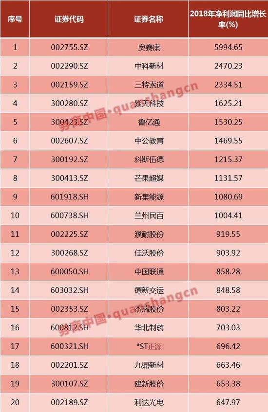 令人稍感欣慰的是,盡管去年整體企業(yè)盈利狀況有所下滑,仍有一些公司增長顯著。奧康賽、中科新材、三特索道、紫天科技等10家公司歸母凈利潤同比增長超過10倍。
