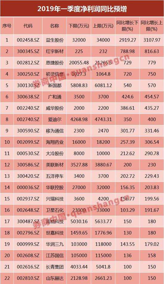 一季度凈利潤同比預(yù)增的公司名單中,增幅超過(同比增長下限)100%的共有22家公司。