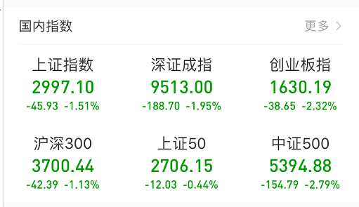今日各大指數(shù)基本單邊下行,上證指數(shù)大跌1.51%,失守3000點,報收2997.1點,跌45.93點;深證成指收跌1.95%,創(chuàng)業(yè)板指收跌2.32%。