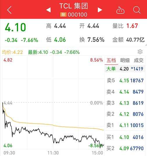 昨日,600億市值的【TCL集團(000100)、股吧】,作為科創(chuàng)板影子股也漲停。不過今日開盤后快速下挫,單邊下跌到收盤跌幅7.66%。