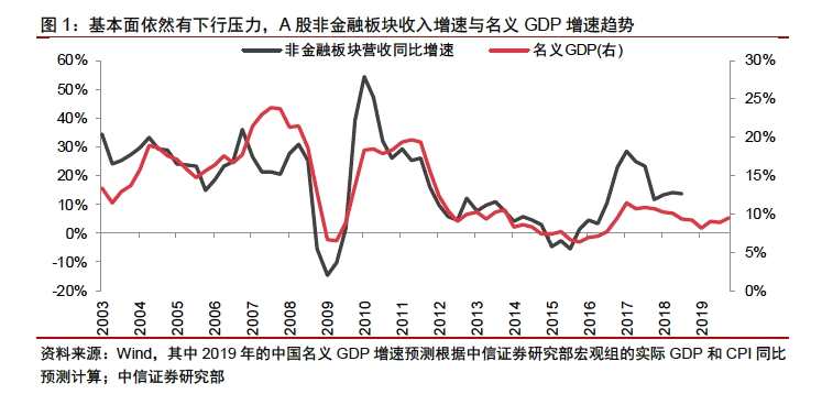 首先是基本面預期還有下調(diào)壓力。中信證券認為,宏觀經(jīng)濟和微觀盈利數(shù)據(jù)密集披露,基本面增速下行的壓力會最終確認。工業(yè)和國有企業(yè)的利潤增速開年繼續(xù)下行,而A股盈利增速至少在2019年二季度-三季度才能見底。