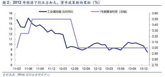 2012年是一個(gè)標(biāo)準(zhǔn)的投資時(shí)鐘式衰退期股票熊市,只是年初躁動(dòng),到年底市場(chǎng)才確認(rèn)經(jīng)濟(jì)見(jiàn)底。2012年年初對(duì)于地產(chǎn)政策也現(xiàn)邊際寬松,全國(guó)超過(guò)34個(gè)二、三城市微調(diào)公積金政策,商業(yè)銀行陸續(xù)開(kāi)啟85折房貸利率優(yōu)惠,4月初,溫家寶總理在調(diào)研各地經(jīng)濟(jì)運(yùn)行情況時(shí)提出“要根據(jù)形勢(shì)變化盡快出臺(tái)預(yù)調(diào)微調(diào)措施”;6月8日和7月6日,央行更是兩次降息,貨幣政策呈現(xiàn)微調(diào)跡象,M2增速階段性回升。而工業(yè)增加值、社會(huì)用電量等實(shí)體經(jīng)濟(jì)數(shù)據(jù)持續(xù)下行,直到四季度才逐步確認(rèn)見(jiàn)底。