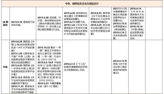 如果從過去幾年政策對市場的映射來看,一旦涉及“國家戰(zhàn)略”的提法,往往都能引起極高的關(guān)注度。但從投資的角度來說,我們還缺少對于政策主題的系統(tǒng)性比較。一方面,不同領(lǐng)域的國家戰(zhàn)略對應(yīng)到A股的可參與性不同;另一方面,“國家戰(zhàn)略”也并不都是平行的,比如“一帶一路”不僅是國家戰(zhàn)略,而且是頂層戰(zhàn)略;再比如雄安新區(qū)有“千年大計”的提法等等。據(jù)不完全統(tǒng)計,十八大以來,中央和國務(wù)院至少提出了以下國家戰(zhàn)略概念: