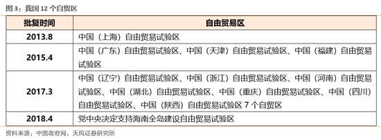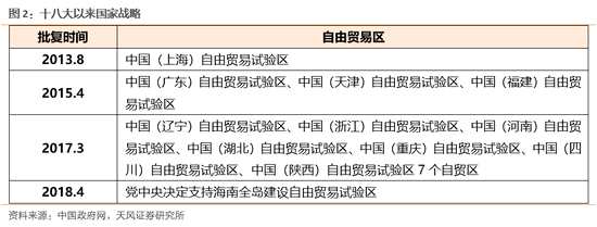 自由貿(mào)易區(qū)早在黨的十七大(2007)就已經(jīng)上升到國家戰(zhàn)略的高度,十八大提出加速實施自貿(mào)區(qū)建設(shè),進(jìn)一步確立了自貿(mào)區(qū)戰(zhàn)略在我國對外戰(zhàn)略中的地位。從2013年上海自貿(mào)區(qū)成立,截止2018年末,國務(wù)院已經(jīng)批復(fù)了12個自由貿(mào)易試驗區(qū):