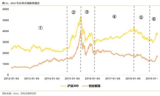 區(qū)間⑥-反彈:2019年1月至今。此階段特點為,市場久跌之后借寬松預(yù)期啟動估值修復(fù)行情,風(fēng)險偏好快速回暖。