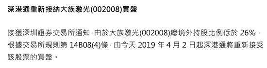 不到一個(gè)月時(shí)間,港交所4月2日再次發(fā)出公告,接獲深圳證券交易所通知,由于大族激光總境外持股比例低于26%,4月2日起深港通將重新接受該股票的買盤。