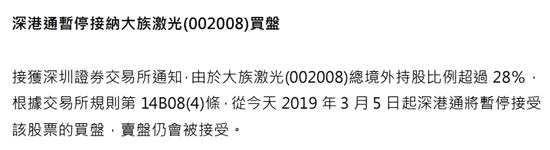 3月5日,港交所發(fā)布公告稱,由于大族激光總境外持股比例超過28%,從2019年3月5日起深港通將暫停接受該股票的買盤,賣盤仍會(huì)被接受。