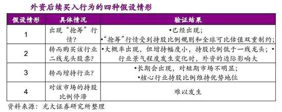 光大證券指出,外資對(duì)大盤藍(lán)籌股的偏好比較有持續(xù)性,當(dāng)偏好股票的持股比例接近30%上限后,外資可能出現(xiàn)以下4種情形: