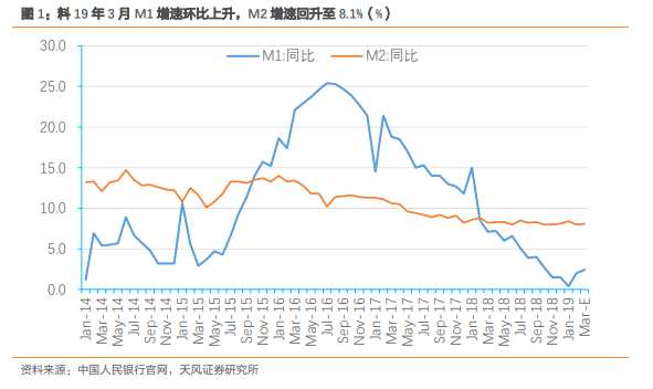 由于3月社融同比大幅多增,預(yù)計(jì)社融增速環(huán)比回升至10.3%,社融增速拐點(diǎn)進(jìn)一步明確。一般而言,社融增速領(lǐng)先名義GDP增速1-2個(gè)季度。19年1月社融增速迎來(lái)拐點(diǎn),經(jīng)濟(jì)19Q2有望企穩(wěn)。由于信貸新增較多及社融同比多增,預(yù)計(jì)M2增速環(huán)比回升至8.1%,M1增速回升至2.4%。隨著寬信用政策逐步發(fā)揮效果,疊加社融低基數(shù),我們預(yù)計(jì)社融增速將進(jìn)一步回升。