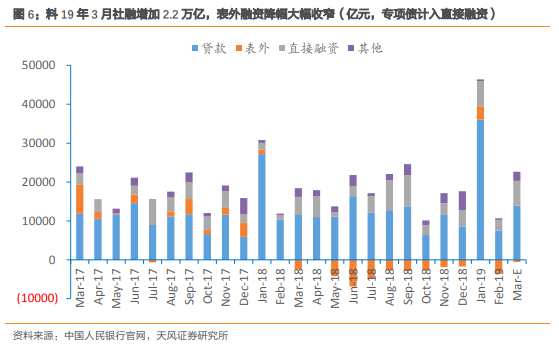 料3月社融2.2萬(wàn)億(18年同期1.58萬(wàn)億,2月7030億),同比及環(huán)比均大幅多增。其中,預(yù)計(jì)對(duì)實(shí)體經(jīng)濟(jì)的RMB貸款+1.4萬(wàn)億。3月份債券發(fā)行利率較低,企業(yè)債券發(fā)行較多,預(yù)計(jì)非金融企業(yè)債券凈融資達(dá)3000億元(據(jù)WIND),股權(quán)約200億元,預(yù)計(jì)地方專(zhuān)項(xiàng)債凈融資3200億,直接融資合計(jì)達(dá)6400億。其他項(xiàng)下,存款類(lèi)金融機(jī)構(gòu)ABS預(yù)計(jì)500億;3月為季末月,貸款核銷(xiāo)預(yù)計(jì)達(dá)1300億。