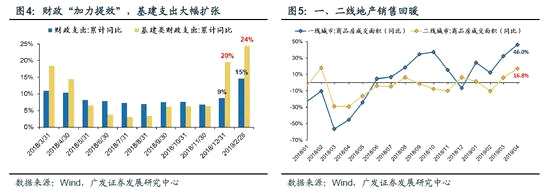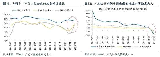 2、去年四季度以來中國金融條件改善初見成效,今年初財(cái)政“加力提效”,一二線地產(chǎn)銷售回暖,3月PMI超出市場預(yù)期,工業(yè)品價(jià)格較為堅(jiān)挺預(yù)示著PPI即將企穩(wěn),這都有助于市場階段性修正原先較為悲觀的中國經(jīng)濟(jì)增長預(yù)期。3月PMI為50.5,環(huán)比2月顯著回升1.3,2-3月環(huán)比幅度創(chuàng)12年以來新高;年初以來財(cái)政“加力提效”,基建支出顯著抬升;今年前3月份一二線城市房地產(chǎn)銷售回暖。廣發(fā)宏觀團(tuán)隊(duì)也判斷,由于PMI原材料和產(chǎn)成品價(jià)格均明顯抬升,PPI將企穩(wěn)回升。但總體上,我們認(rèn)為中國經(jīng)濟(jì)面臨的是高杠桿結(jié)構(gòu)性問題,而非過往靠需求端政策刺激就能解決的周期性問題,經(jīng)濟(jì)即使觸底也難有較持續(xù)的回升。二季度市場可能出現(xiàn)對實(shí)體經(jīng)濟(jì)的看法從“轉(zhuǎn)向邊際樂觀”到 “發(fā)現(xiàn)改善持續(xù)性不強(qiáng)”的過程——我們預(yù)計(jì)A股剔除金融盈利增速19年全年-5.6%,盈利底部大概率在二季度出現(xiàn)。