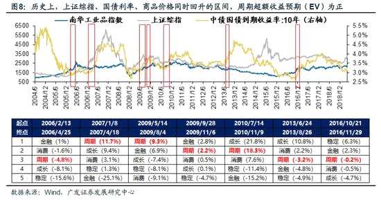 3、3月PMI公布后大類資產(chǎn)表現(xiàn)反應(yīng)經(jīng)濟(jì)增長企業(yè)盈利預(yù)期上調(diào),核心矛盾從分母端階段性轉(zhuǎn)向分子端。歷史上類似階段,周期股漲幅排名大多靠前,且超額收益的預(yù)期(EV)為正。資本市場正在從分母端驅(qū)動(dòng)轉(zhuǎn)向分子端驅(qū)動(dòng):近期國債利率顯著回升,商品價(jià)格上漲,分子端驅(qū)動(dòng)周期股開始獲得超額收益——4月第一周10年期國債收益率大幅回升20 BP,南華工業(yè)品指數(shù)上升4%。前期滯漲的周期股相對上證綜指的超額收益排名居前(2.06%)。歷史經(jīng)驗(yàn)顯示,在分子端驅(qū)動(dòng)的行情中,周期股獲得超額收益的預(yù)期(EV)為正——2004年以來,A股由分子端驅(qū)動(dòng)的上漲行情(商品價(jià)格指數(shù)回升 & 無風(fēng)險(xiǎn)利率回升)總共有7次(下圖8),其中,周期股有4次超額收益為正且排名靠前。我們認(rèn)為寬貨幣向?qū)捫庞脗鲗?dǎo)初見成效,過度悲觀的盈利預(yù)期將階段性修復(fù),周期行業(yè)也將階段性迎來補(bǔ)漲行情。
